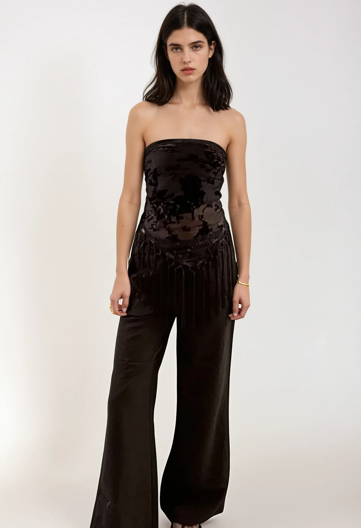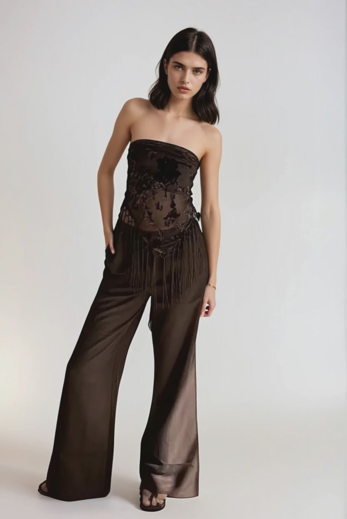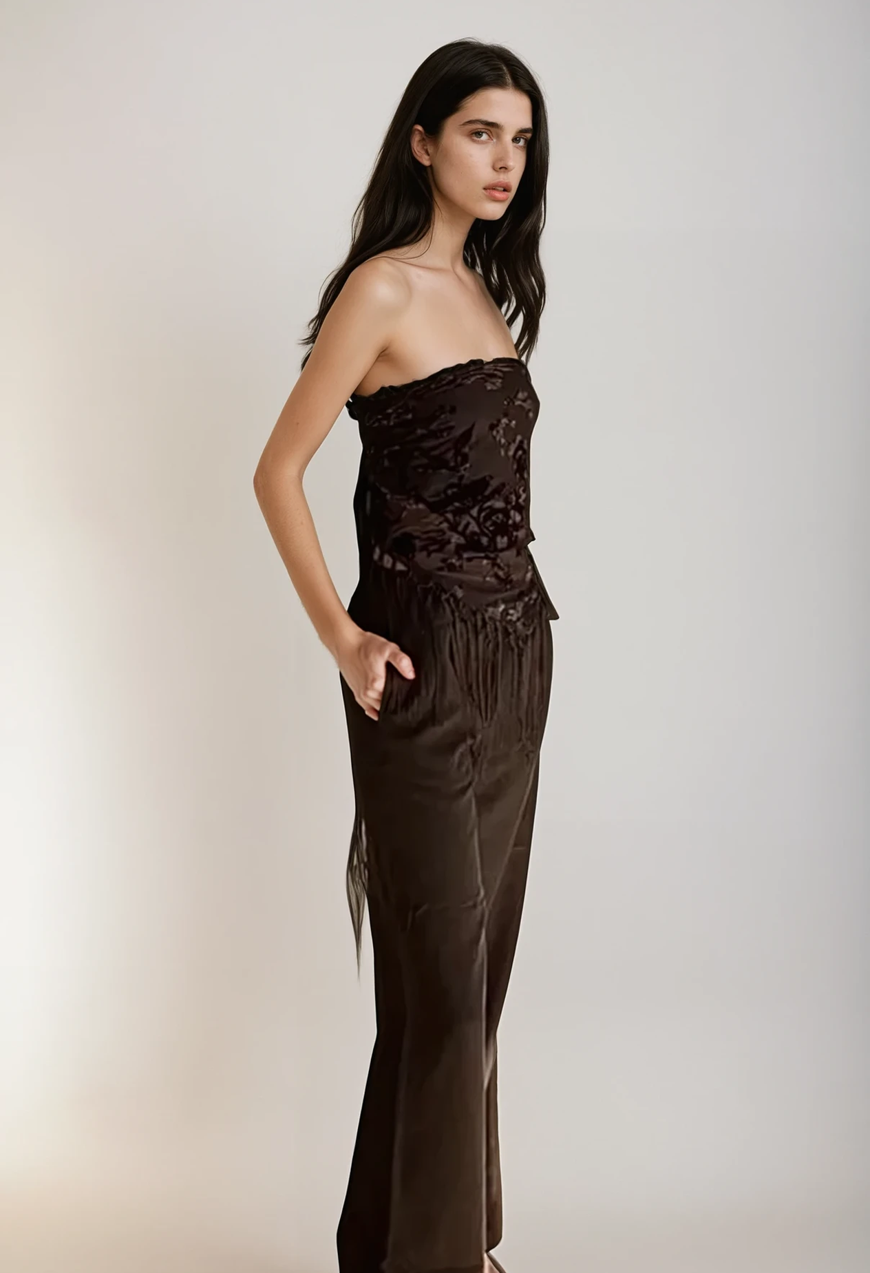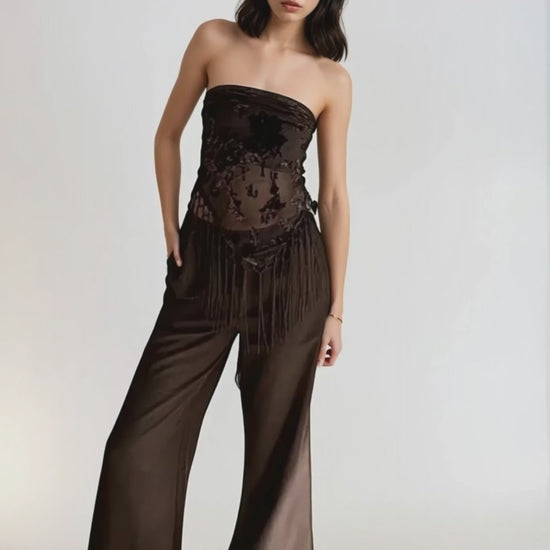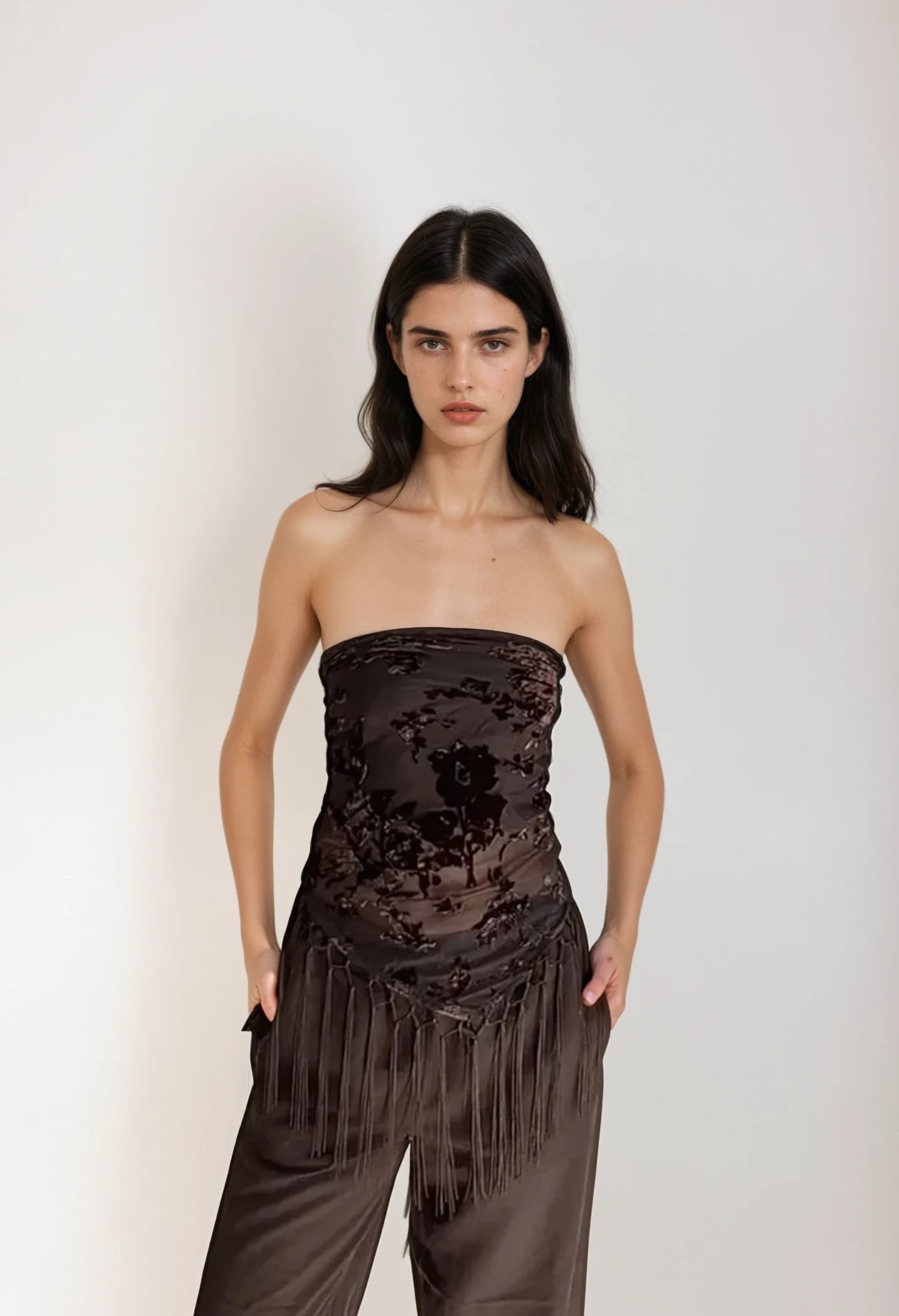 A refined addition to the modern wardrobe, this devoré scarf in dark maple is cut in a fluid triangle silhouette and crafted from delicate burnout fabric with a soft, semi-sheer finish. Lightly fringed and finished with tactile tassels, it moves effortlessly with the body, designed to be styled multiple ways: draped over the shoulders, wrapped at the waist, or knotted at the neck. Lightweight yet considered, it offers subtle texture and timeless versatility.