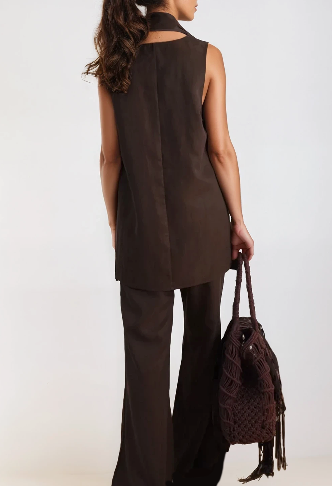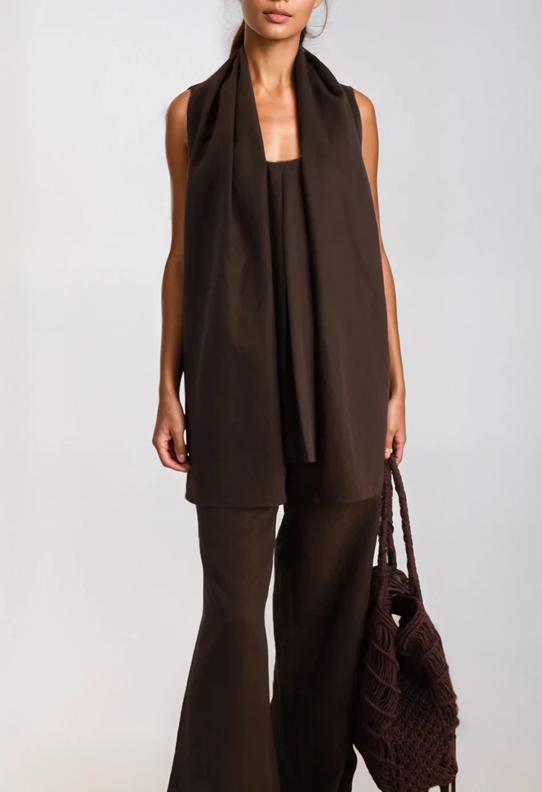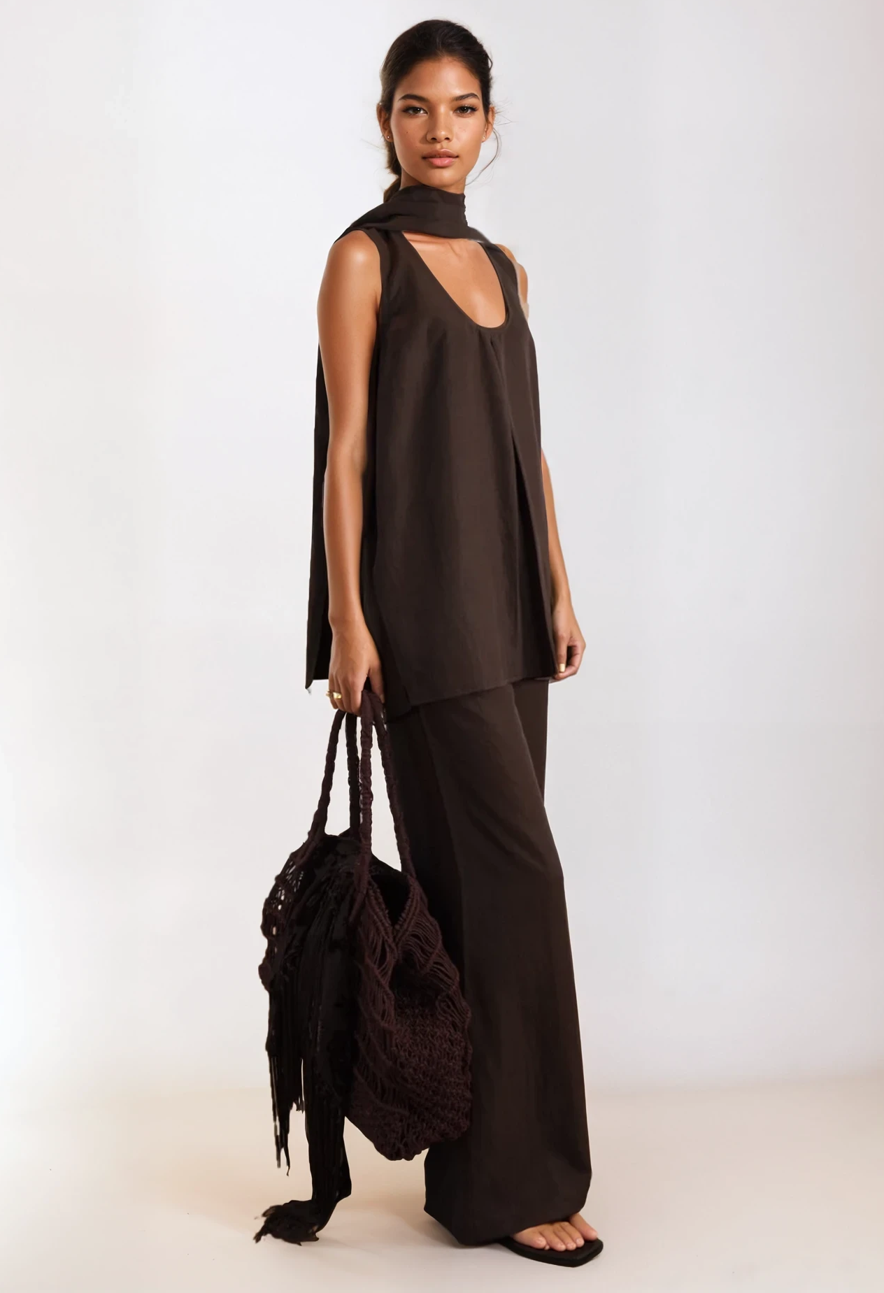 A minimalist staple designed for modular styling. The Manon Scarf Top is crafted from a breathable lyocell blend that falls fluidly over the body. Designed with a detachable scarf that attaches at the centre back neckline, this piece offers versatility in styling. The scarf can be worn draped around the neck, tied at the waist, or removed entirely for a clean, pared-back look allowing you to adapt your styling.