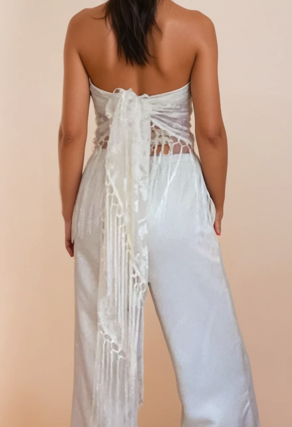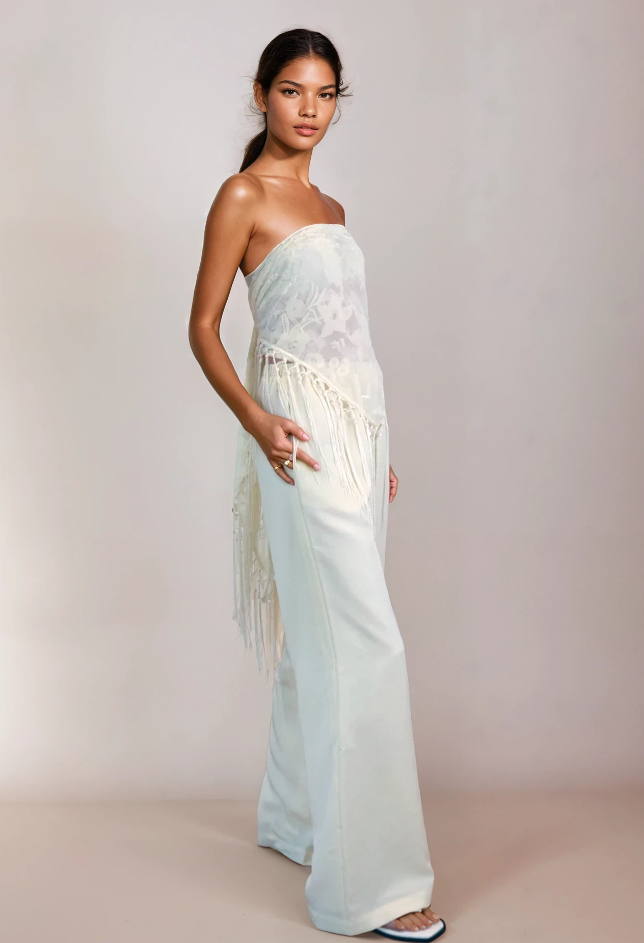 A refined addition to the modern wardrobe, this cream devoré scarf is cut in a fluid triangle silhouette and crafted from delicate burnout fabric with a soft, semi-sheer finish. Lightly fringed and finished with tactile tassels, it moves effortlessly with the body, designed to be styled multiple ways: draped over the shoulders, wrapped at the waist, or knotted at the neck. Lightweight yet considered, it offers subtle texture and timeless versatility.